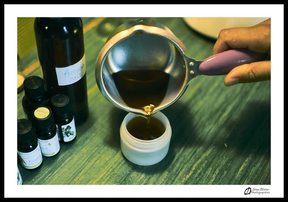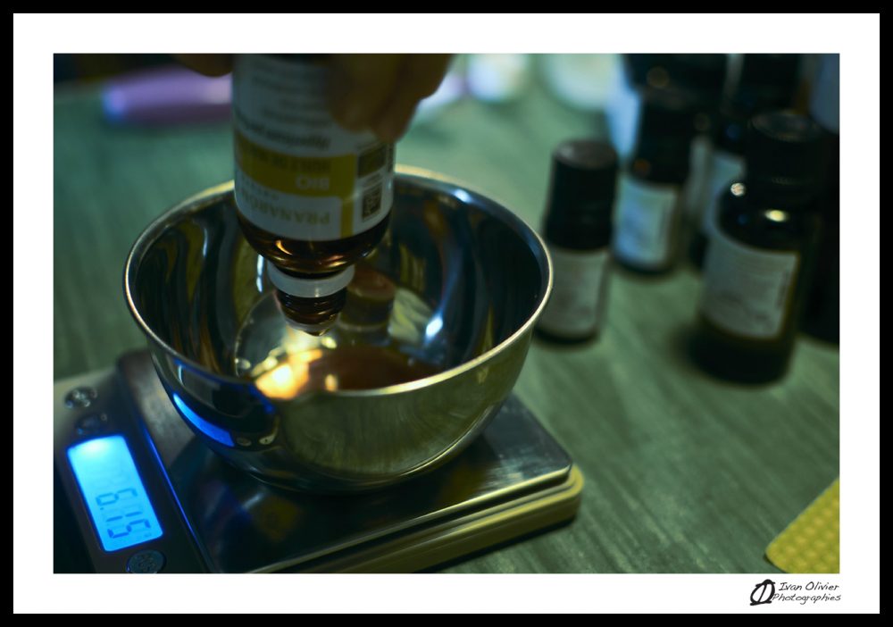 4° Ajouter les huiles essentielles en filet, à la préparation pas trop chaude tout en remuant.