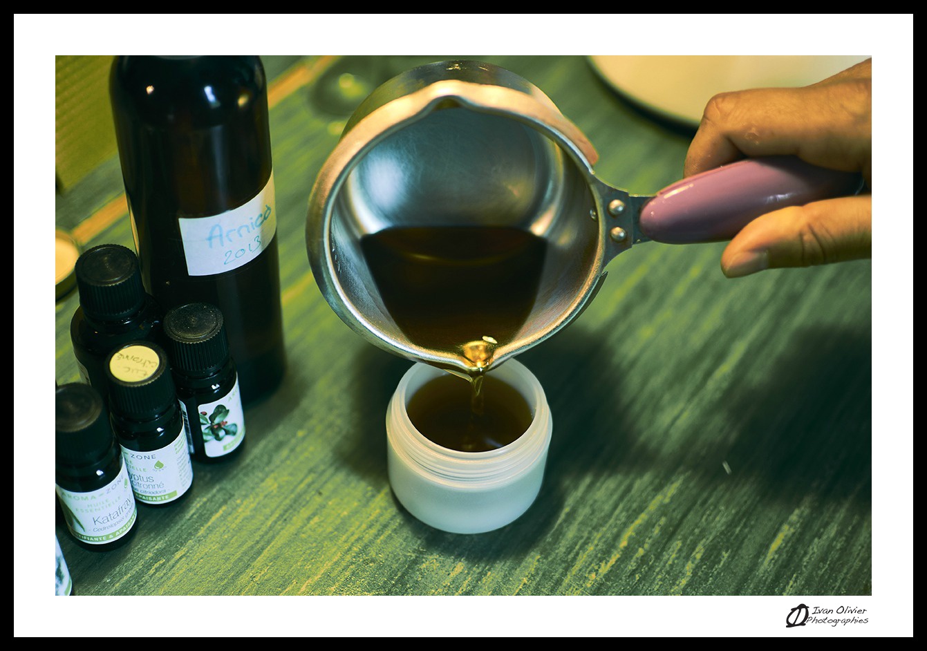 1° Peser, à l’aide d’une balance de précision, la cire d’abeille ainsi que l’huile d’arnica et de millepertuis, puis les transvaser dans un récipient en inox ou en verre allant au bain-marie. Faire chauffer doucement. Ne plus toucher au bol et laisser fondre tranquillement.