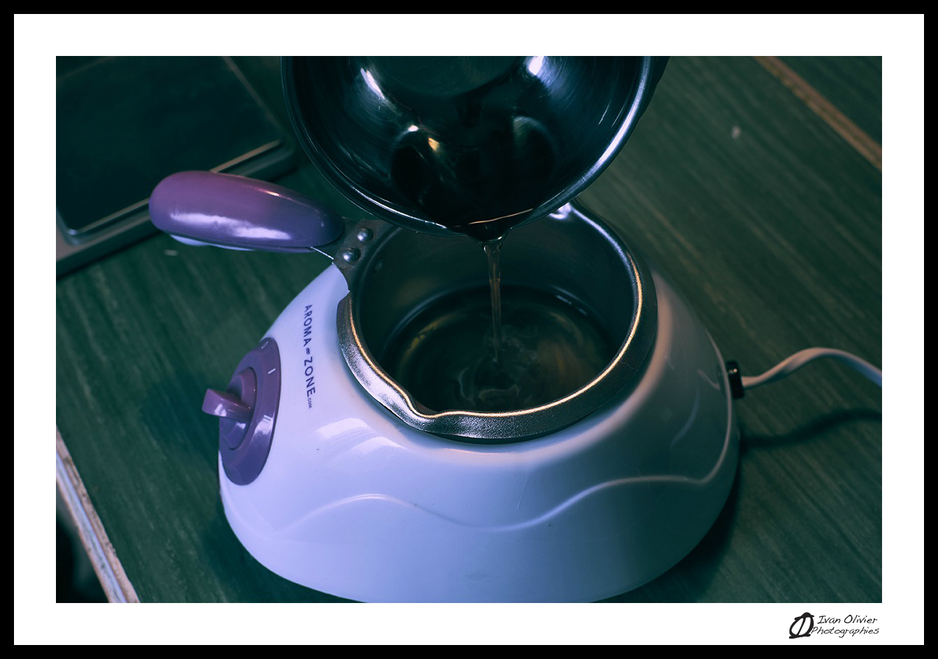 4° Ajouter les huiles essentielles en filet, à la préparation pas trop chaude tout en remuant.