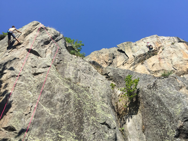 Si vous venez en Ariège, il faut vraiment venir se confronter au granit compact d’Auzat, dans la vallée du Vicdessos! Le manque de mains, quand nous n’y sommes pas habitués, est… déroutant! 😉 Mais les pieds accrochent! Un rocher qui apprend l’adhérence et la confiance dans ses pieds! On aime ou on déteste mais il ne laisse personne indifférent! On y trouve de jolies dalles, des fissures, des dièdres tous lisses… Pas de patine sur ce rocher bien râpeux mais pas mal de monde sur la falaise école située à 5-10 minutes de marche du parking. Pour la saison estivale, préférez les secteurs Ecole et Montcalm qui sont un peu plus abrités sous les arbres.