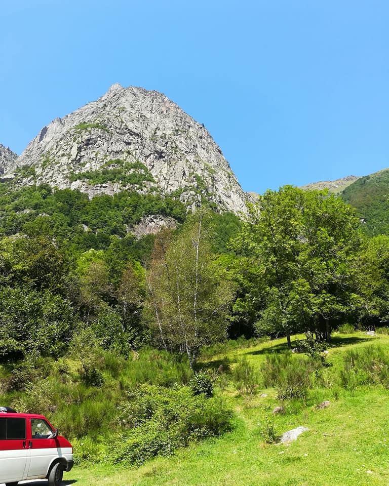 Les Grandes Voies: On compte 4 secteurs de grandes voies à Orlu, de quoi faire! Avec plus ou moins de marche d’approche (minimum 30 min) C’est un superbe granit, typé montagne, avec un peu de lichen et quelques fois de la végétation selon les voies. Il y’en a pour tous les niveaux, toutes les longueurs et même la rivière pour se délasser les pieds en fin de journée! Ci-dessous, vue depuis le parking P3 « Pont du Bisp », vers la face sud-est, 1ère voie « La canne de Serin » 4L, 6a+ max en 185m, Aout 2018.