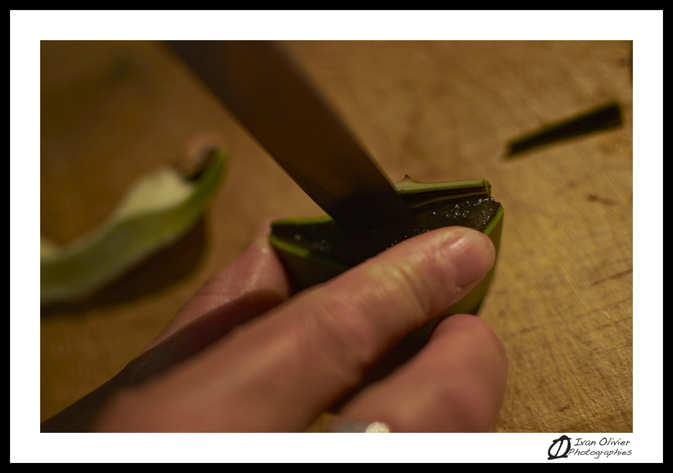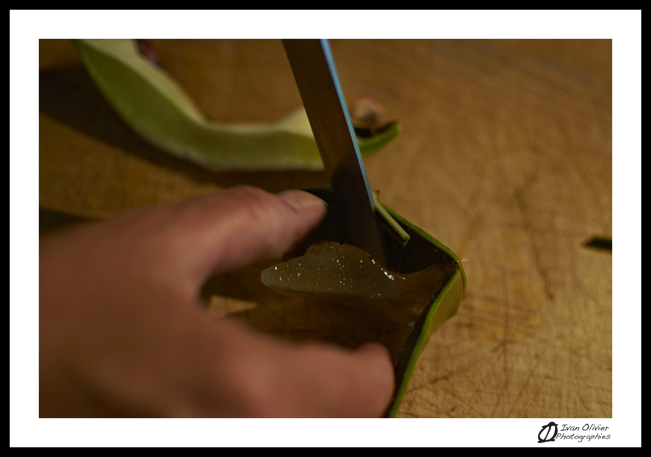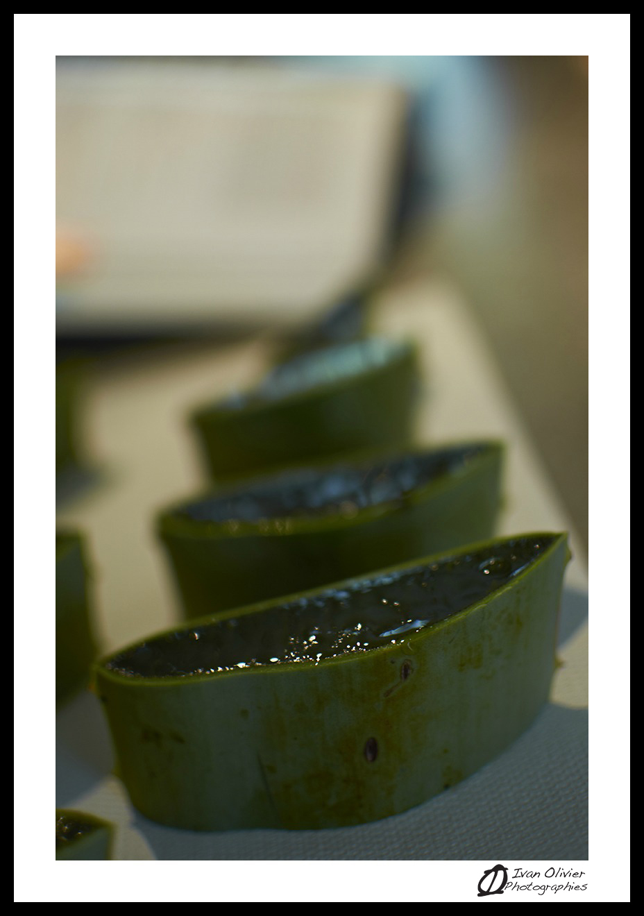 5° Prélevez la pulpe centrale (gel) et transvasez-la dans un bol en inox. (ou utilisez-la telle quelle!)