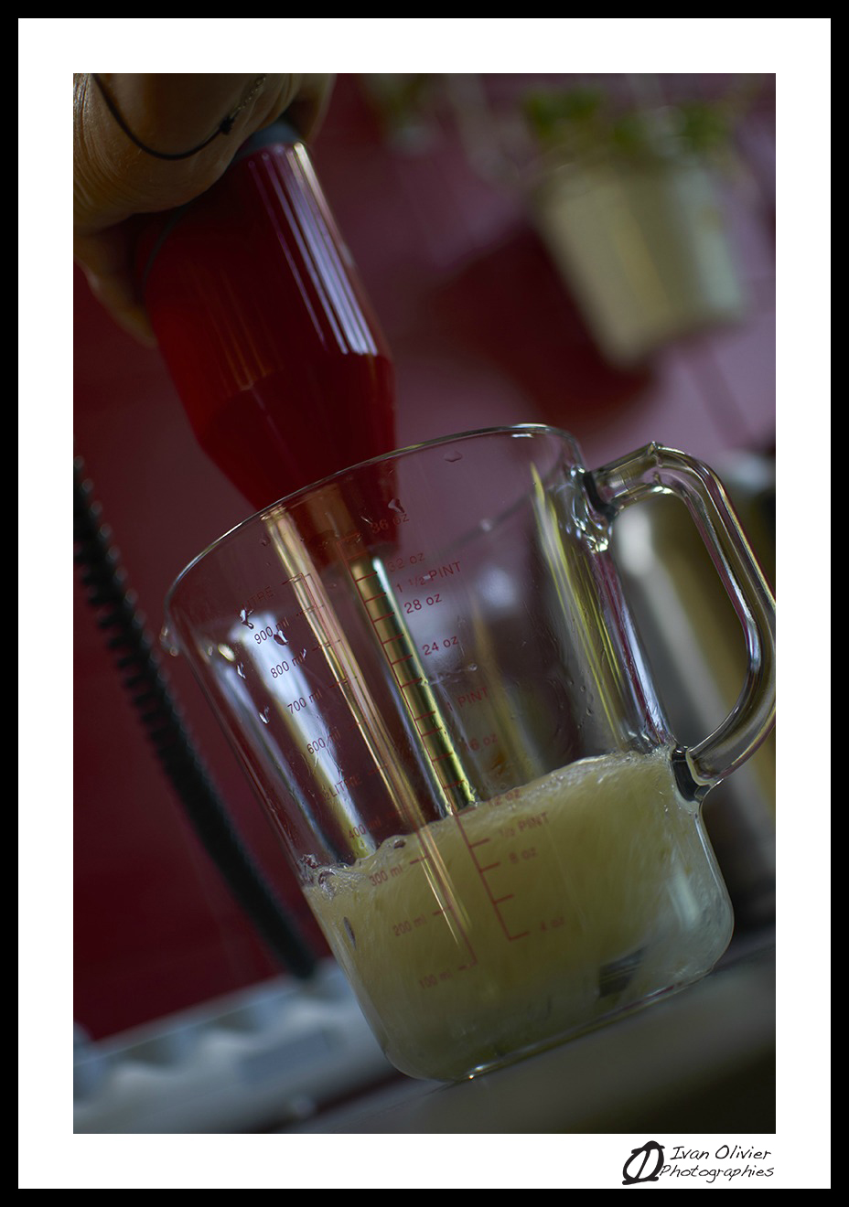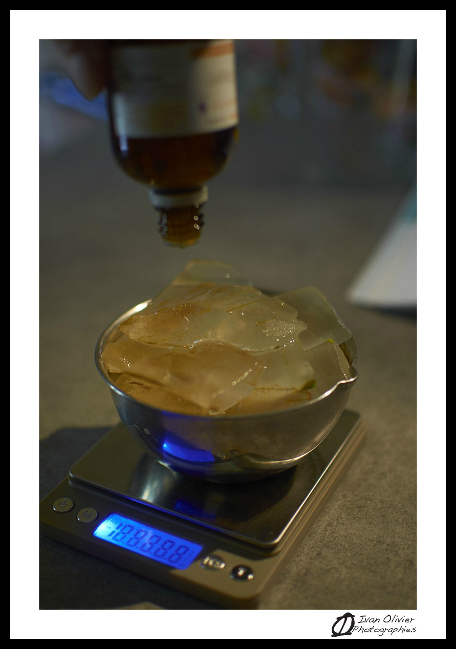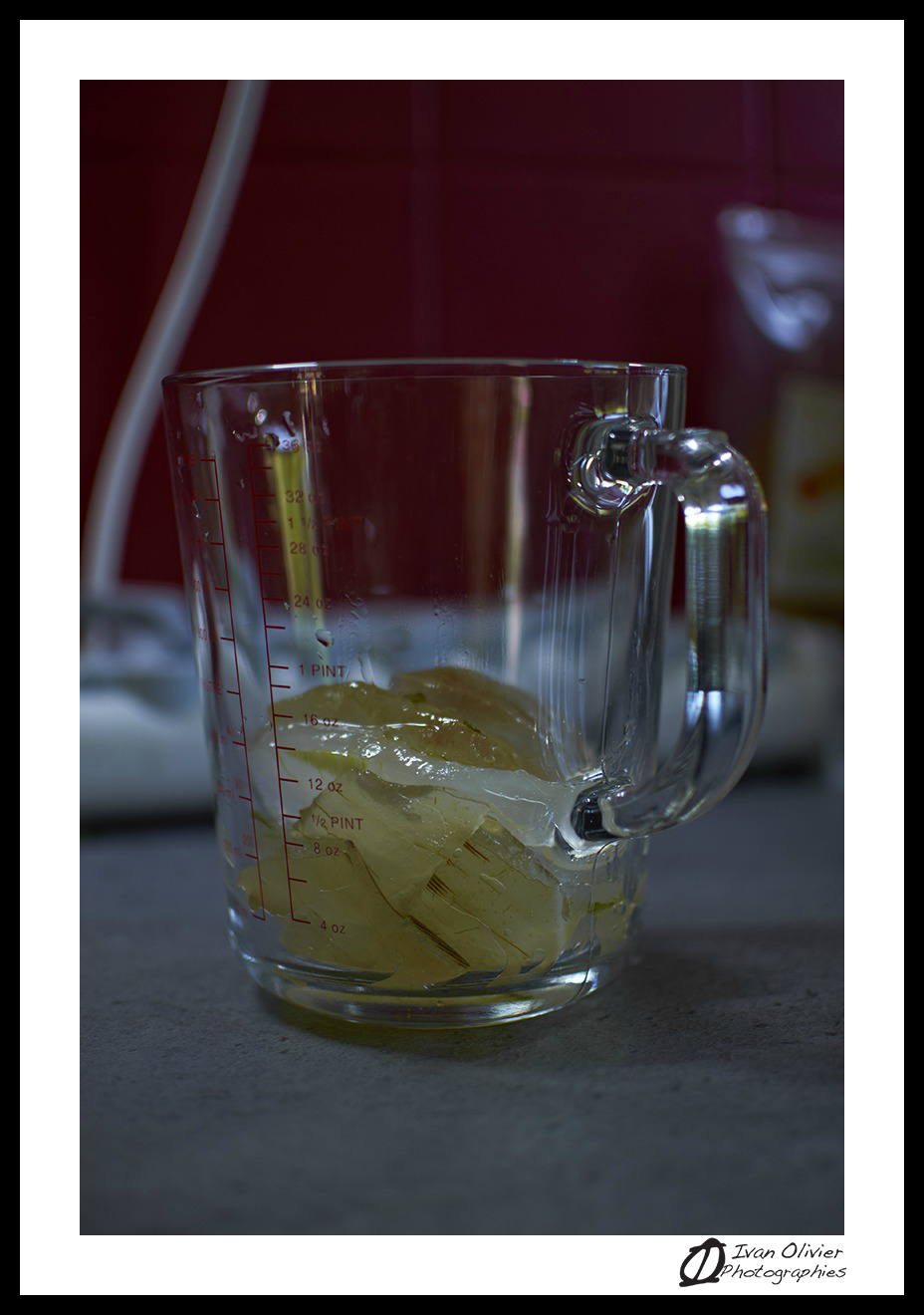 6° Pesez, à l’aide d’une balance de précision, le gel ainsi obtenu puis ajoutez le conservateur. Vous pouvez supprimer cette étape si vous comptez boire le jus formé par exemple. Il sera alors indispensable de le conserver au maximum 1 semaine au frigo.