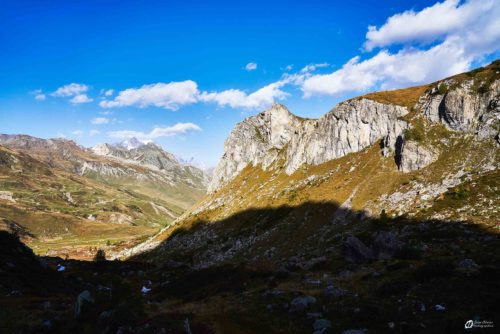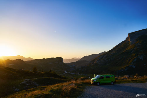 Il y a de multiples possibilités sur les différents parkings le long de la D902. Notre choix s’est porté c’est un parking qui offre un panorama sympathique sur le Rocher des Vents et le Roc du Biolley en face et la Dent d’Arpire et l’Aiguille du Grand fond sur le côté. En octobre nous n’avons pas été embêtés par le bruit des voitures la nuit.