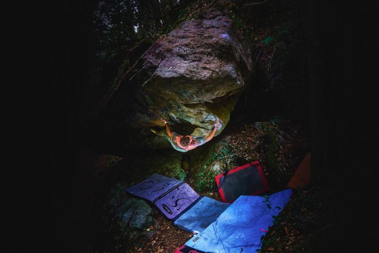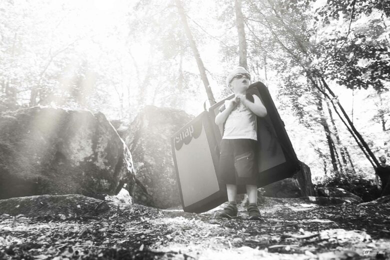 Comment j’arrive à trouver / dénicher les anciens et nouveaux blocs ? Avec mon chien ! Les balades avec lui m’aident beaucoup autour de chez moi. Ensuite je regarde beaucoup Google Maps et j’écoute les anciens : forestiers, paysans, grimpeurs. Ah oui, le plus important…avoir l’œil du lynx ! Prendre le temps de regarder autour de soi. Il y a aussi un côté très personnel, je n’aime pas trop le monde, genre 2/3 personnes pas plus pour grimper. Ça me pousse à rechercher des spots ailleurs, loin de la foule. La découverte d’une belle ligne c’est cool, c’est un peu une drogue maintenant.