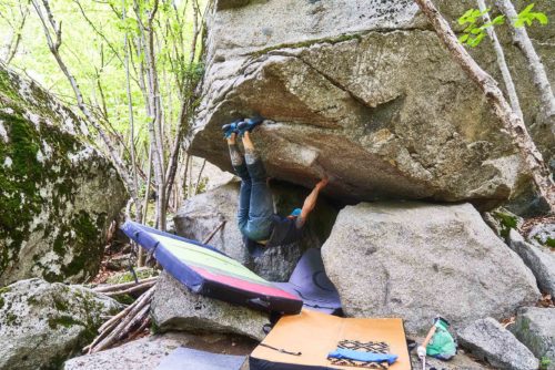 Le 3e et dernier jour, nous décidons de visiter plusieurs secteurs de blocs avec les copains. 1er arrêt après la cabane de l’entrée du parc national au secteur Toirigo dans l’optique de trouver des lignes de tous niveaux (29 lignes entre le 6a et le 6c+ !) et surtout sèches après l’orage de la veille. Le 1er bloc se trouve directement au niveau du parking. Ce bloc est parfait pour l’échauffement avec de belles lignes, courtes mais techniquement très intéressantes.