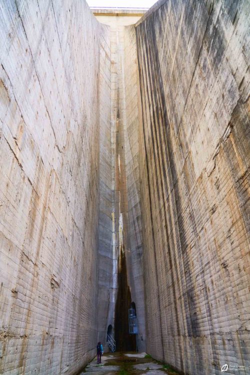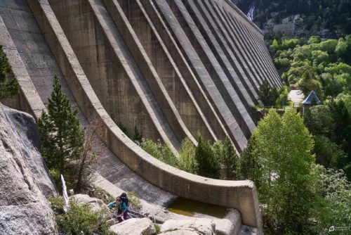 L’aventure commence le 2ème jour. Nous décidons d’aller explorer les secteurs de couennes en rive droite du lac. Il est dit dans le topo qu’il existe une vague sente qui mène aux 15 secteurs. Après un réveil assez tôt, nous allons nous garer au dernier parking sous le barrage pour prendre le petit déj’ et profiter de la vue sur la vallée. De là, il nous a fallu trouver le sentier pour passer le barrage…. ce fut le début des aventures. Nous avons découvert qu’il était possible de rentrer dans les piles du barrage et de le remonter pour accéder aux premiers secteurs. C’est assez ambiance de rentrer DANS le barrage mais sachez qu’il est possible de marcher SUR le barrage (beaucoup plus rapide et facile quand même…). En fait, on avait juste voulu chercher le chemin indiqué sur le topo…