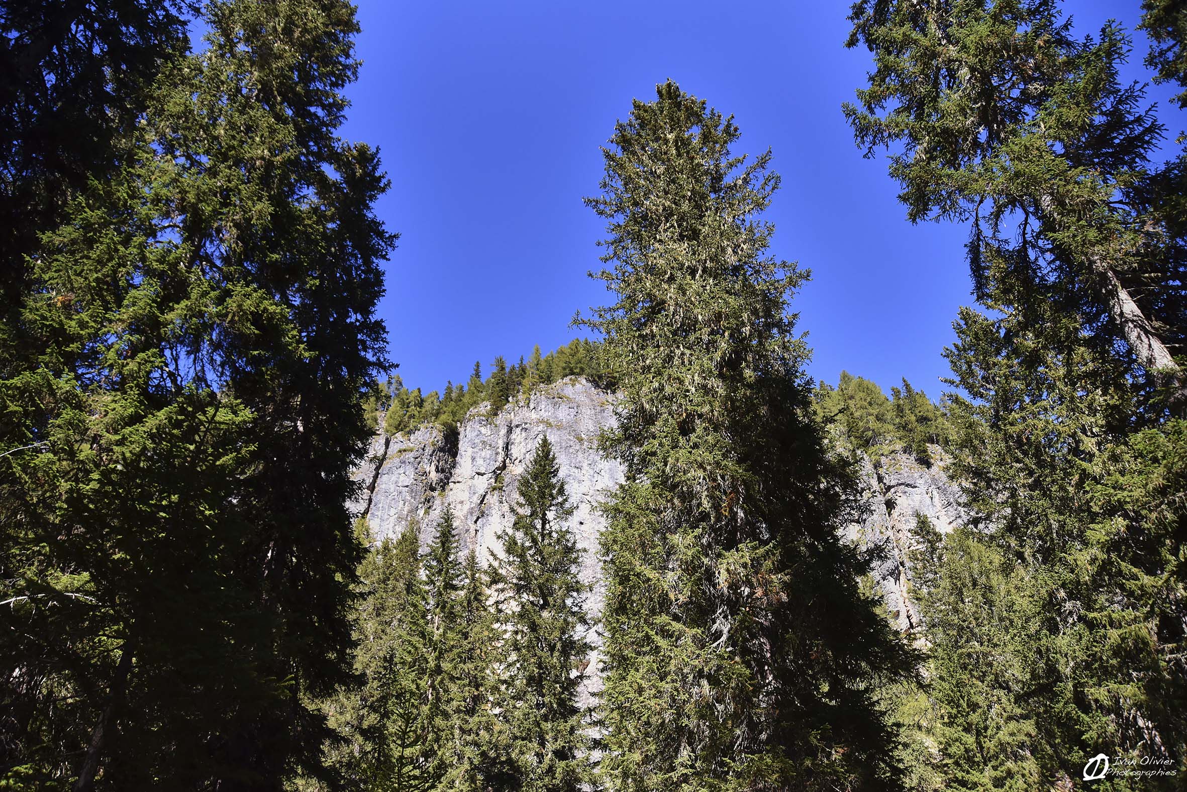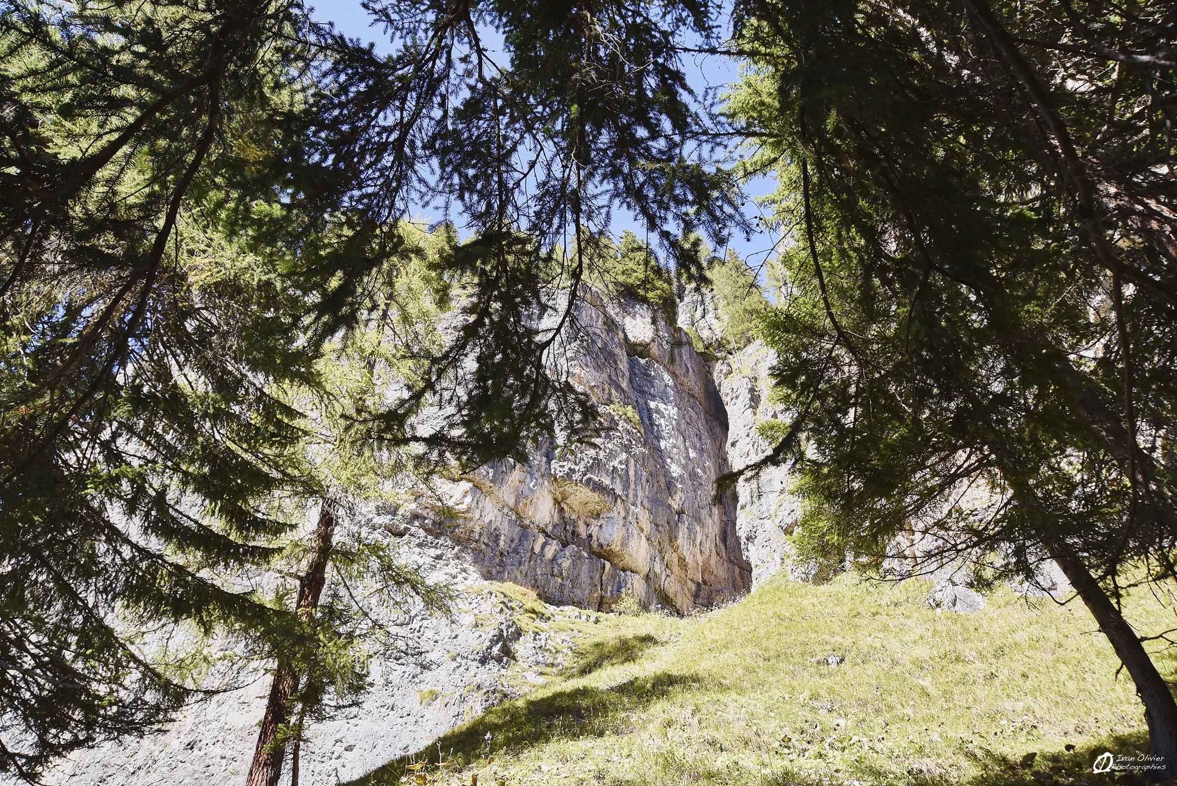 La falaise est exposée plein Sud. A l’ombre des arbres elle est idéalement située.