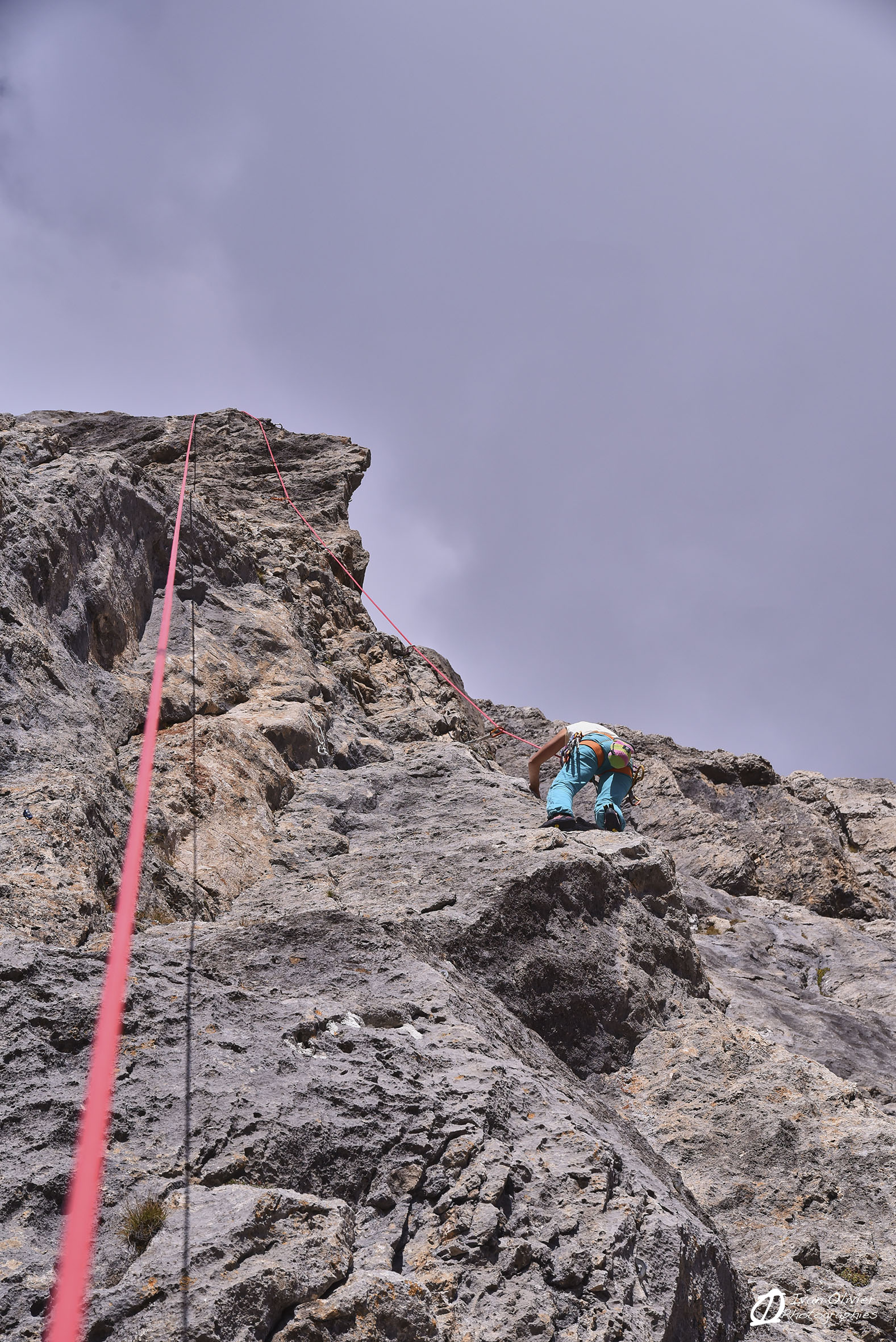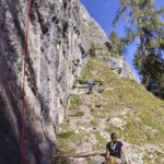 La falaise, située sous la gare et le refuge, se compose de 5 secteurs. Là, les cotations sont sèches! Vraiment sèches! Certes, l’éloignement des points peut faire jouer le mental mais sur le secteur Funivia il ne faut pas s’attendre à faire des perfs! La première voie en 5a nous a bien refroidie! C’est l’une des premières falaises équipées dans les Dolomites et ça se ressent au niveau de la patine de certaines voies. Ici les voies sont techniques sur petites prises où la lecture et l’anticipation sont de rigueur! Nota: Même si c’est une ancienne falaise, le caillou bouge toujours et nous avons fait partir des blocs, donc méfiance!