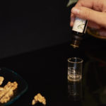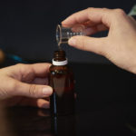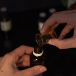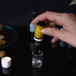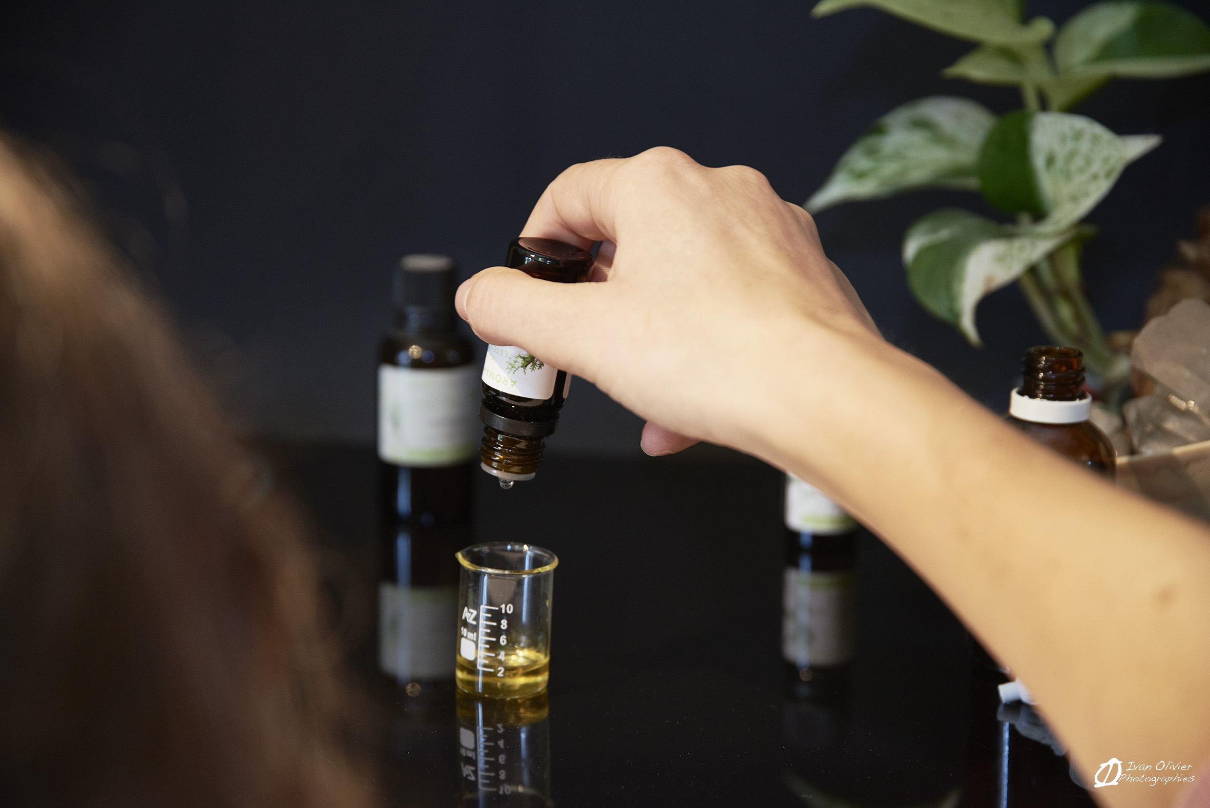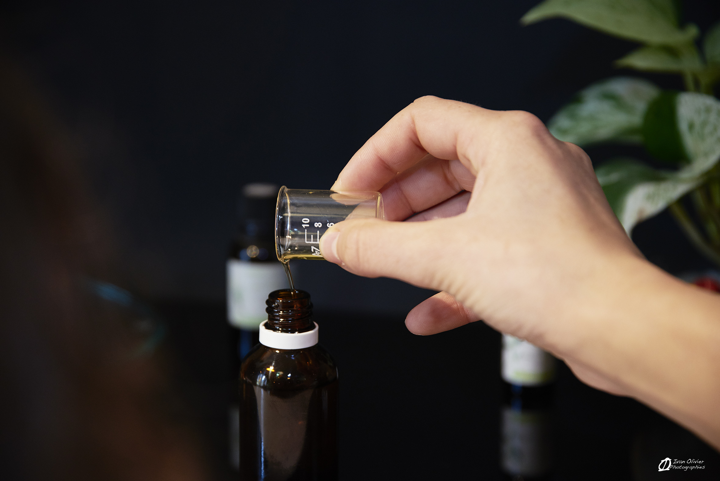 Mesurer, à l’aide d’un bécher en verre gradué au ml près, les huiles essentielles une à une et les verser au fur et à mesure dans le flacon contenant les HV.