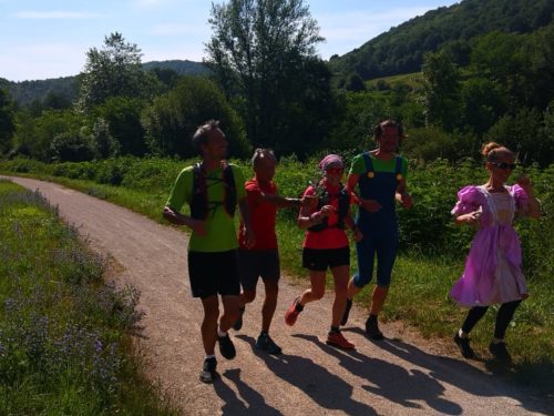 Vers les 30 km… chacun son mur? Le tunnel de Rimont approche et là, ce ne sont pas les jambes qui n’ont plus voulu me porter mais mon genou gauche qui a commencé à « flancher ». Pas de douleur mais juste des flanchages comme si je boitais sur certaines foulées. Dans ma tête, s’est allumée une lanterne rouge « warning » et j’ai pensé « fracture de fatigue ». Comme je voulais arriver au bout et à priori sans me blesser, j’ai ralenti l’allure. Malgré çà, mon genou a continué à me faire des siennes de façon relativement rapprochée, je n’avais pas vraiment de douleur à ce genou, mais une sensation bizarre. A la sortie du tunnel (31km), j’ai sorti mon spray aux huiles essentielles pour les muscles et articulations. J’ai pris le temps de masser, de marcher un peu, puis de repartir de façon tranquille. Cette fois-ci accompagnée d’une nouvelle copine, Gougou, pour les 10 derniers km. « Gougou, cette fois-ci, ce ne sera pas un blabla run! je suis focus sur mon genou! Vas-y, fais-moi rire ma copine! On est des machines ou pas?! »