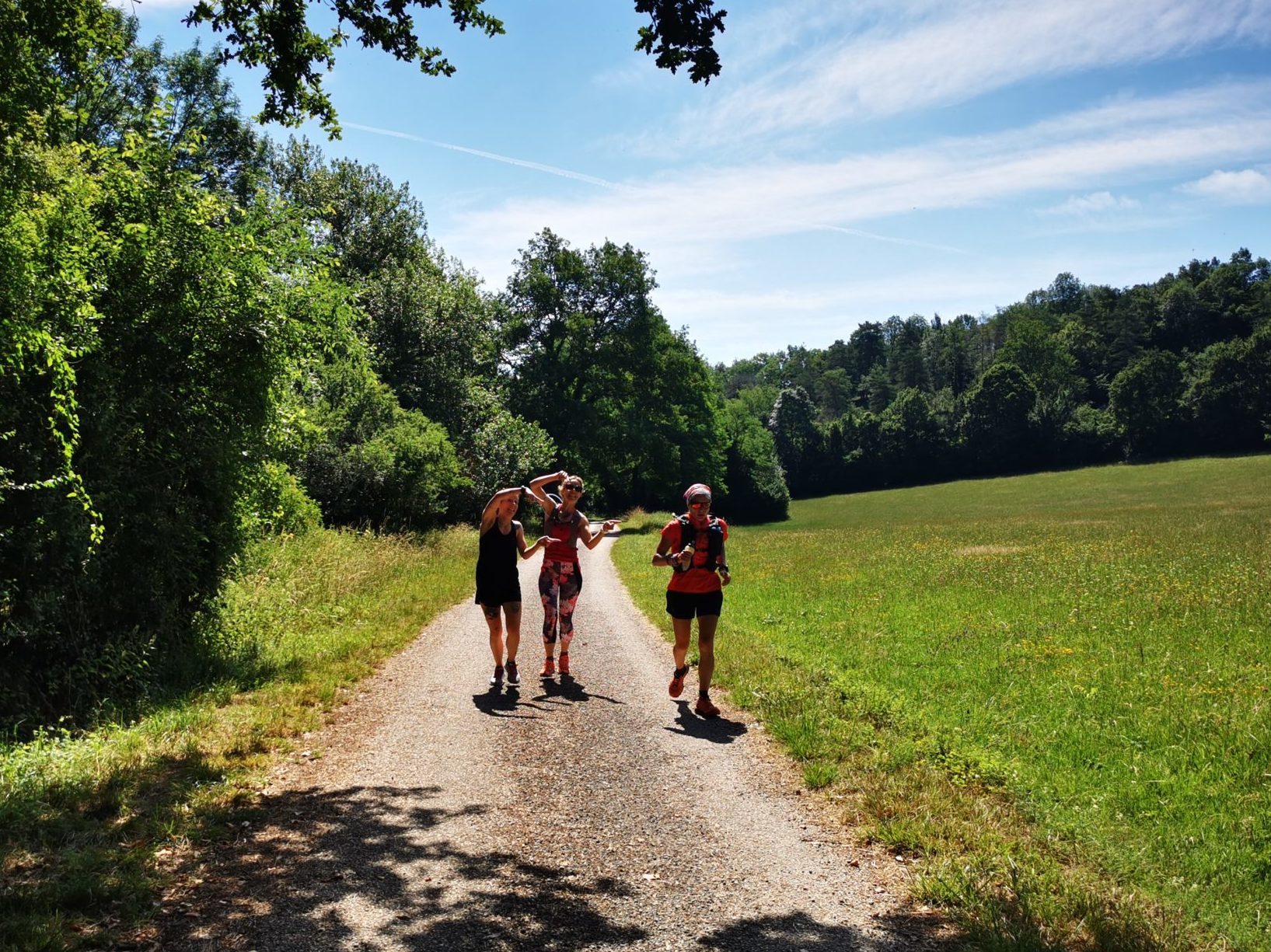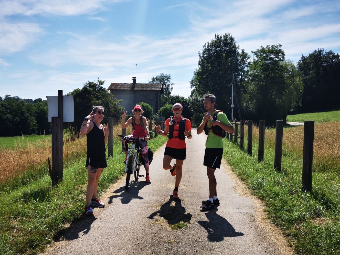 6h40, on part pour Foix. Arrivée aux Bruillols un peu avant 7h. Un coup de crème solaire et… çà y’est, je suis fin prête! Petite photo de groupe au panneau d’accueil de la voie verte. Il manque Gougou qui nous rejoindra pour courir les 10 derniers km avec moi à la gare de Rimont.