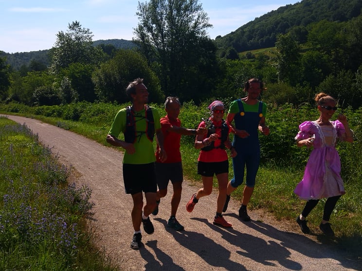 Vers les 30 km… chacun son mur? Le tunnel de Rimont approche et là, ce ne sont pas les jambes qui n’ont plus voulu me porter mais mon genou gauche qui a commencé à « flancher ». Pas de douleur mais juste des flanchages comme si je boitais sur certaines foulées. Dans ma tête, s’est allumée une lanterne rouge « warning » et j’ai pensé « fracture de fatigue ». Comme je voulais arriver au bout et à priori sans me blesser, j’ai ralenti l’allure. Malgré çà, mon genou a continué à me faire des siennes de façon relativement rapprochée, je n’avais pas vraiment de douleur à ce genou, mais une sensation bizarre. A la sortie du tunnel (31km), j’ai sorti mon spray aux huiles essentielles pour les muscles et articulations. J’ai pris le temps de masser, de marcher un peu, puis de repartir de façon tranquille. Cette fois-ci accompagnée d’une nouvelle copine, Gougou, pour les 10 derniers km. « Gougou, cette fois-ci, ce ne sera pas un blabla run! je suis focus sur mon genou! Vas-y, fais-moi rire ma copine! On est des machines ou pas?! »