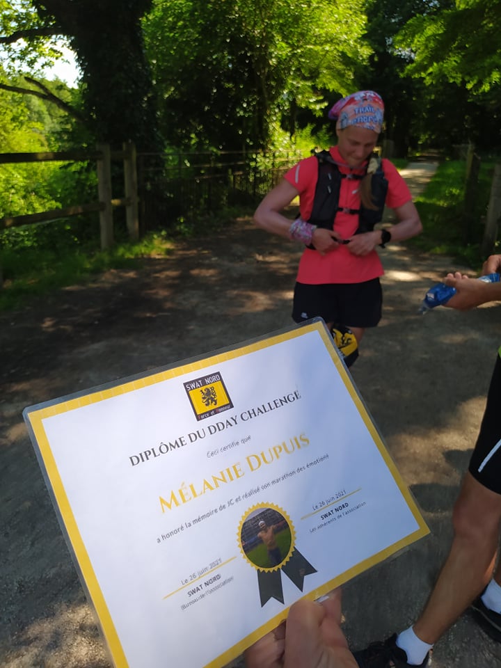Sylvie me glisse alors l’enveloppe du Swat Nord: j’ai enfin le droit d’ouvrir! Merci à toute la team de mon frère! Merci d’avoir été avec moi. Un tee shirt à l’effigie des Swat « force et honneur« , une médaille gravée du jour et le diplôme de ce DDay Challenge pour la mémoire des 1 an de mon frère, la réalisation de ce marathon des émotions. Une bonne bouffée d’émotions justement à la lecture de ce dernier. On ne reviendra jamais en arrière. Avancer et Vivre de façon à n’avoir aucun regret sur une autre ligne d’arrivée…