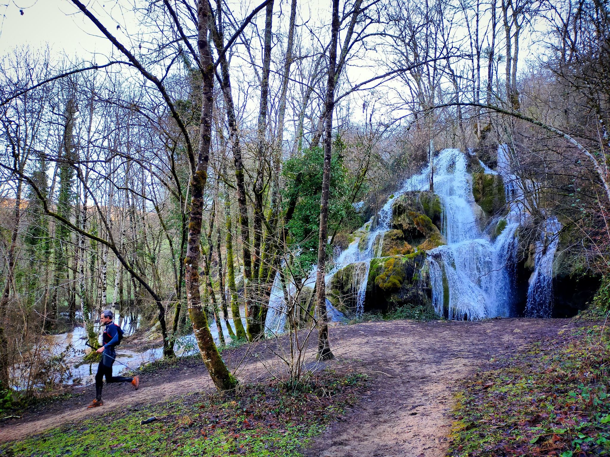 - (~13km) Sur la gauche, une ouverture dans un champs et des indications en rouge à la peinture. Traverser le pré pour retrouver un sentier qui débouche sur le coté gauche des cascades. Si elles sont bien en eau, il faudra remonter un peu sur la gauche mais pas jusqu’au sommet de la cascade qui risque d’être vraiment bien inondé. Au niveau intermédiaire, on retrouve des pontons de bois qui aident à traverser, puis il faudra s’aider des bâtons pour enjamber le denier « ruisseau ».