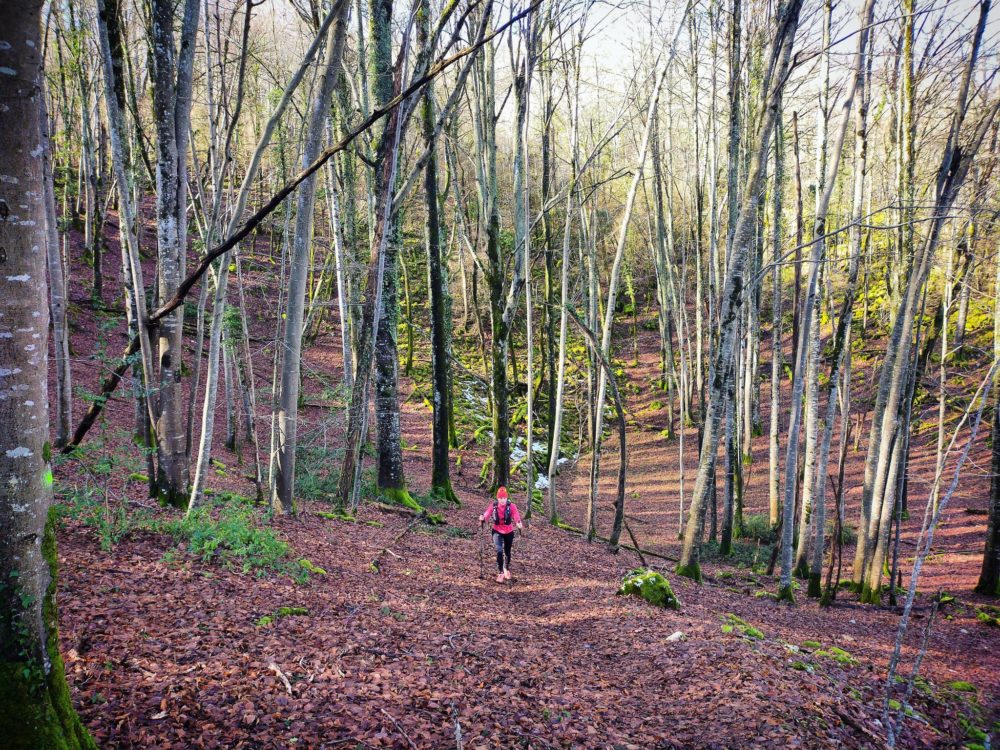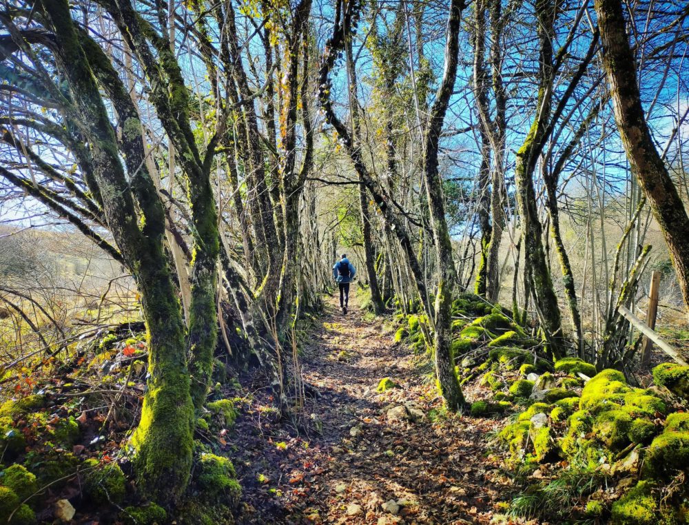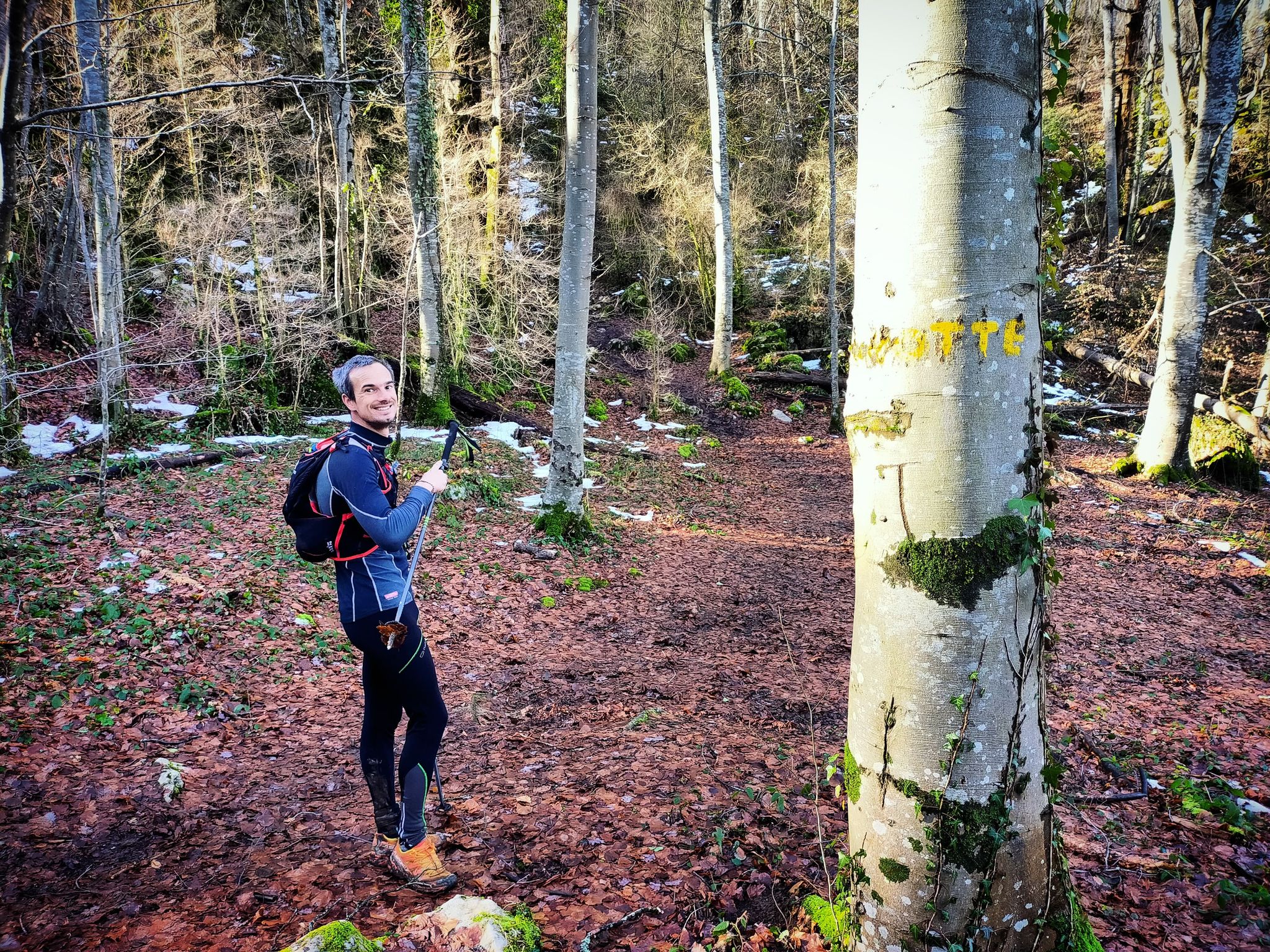 - (~4km) Ne pas louper le sentier qui coupe à travers bois sur la gauche en montant. Cette sente n’existe pas sur l’IGN, sur place elle est bien tracée et indiquée avec des points jaunes fluo. On attaque une chouette partie très jolie boisée puis d’anciens chemins empierrés (?) sur Mil Nègre.