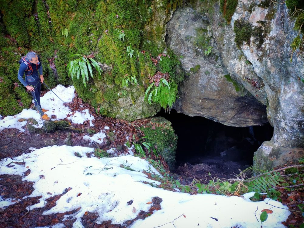 Discrètement indiquée par une peinture jaune sur un hêtre, la grotte dite « de l’Eglise Catholique » s’ouvre à la base d’une falaise verticale couverte de mousses et de fougères. Elle aurait abrité des messes pendant la Révolution, d’où son nom. Nous n’y sommes pas entrés car nous n’avions ni frontales ni les conditions idéales avec un terrain glissant. En effet, il est indiqué sur certains sites que l’accès à sa grande salle se fait en empruntant une descente à forte pente sur 40 à 50m et très glissante en cas de pluie. Sur la droite avant la grotte, il reste les ruines d’un orri (= ancien abri de bergers en montagne).