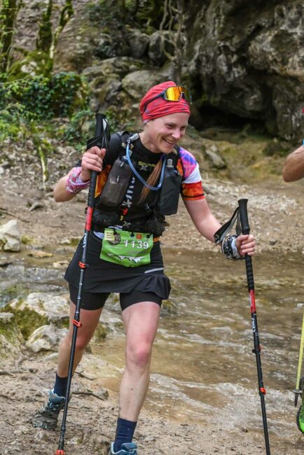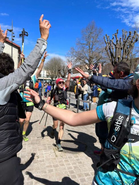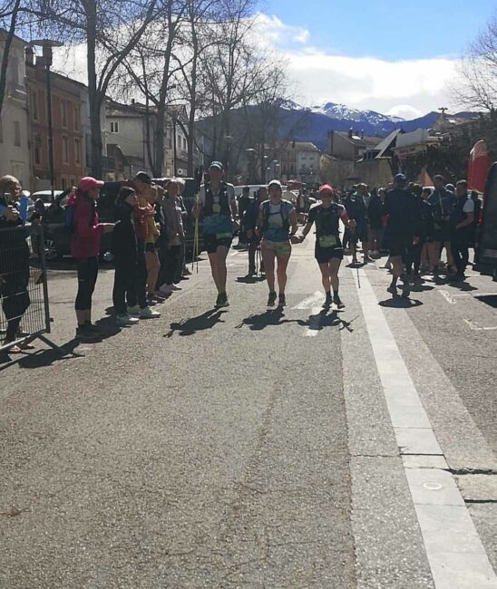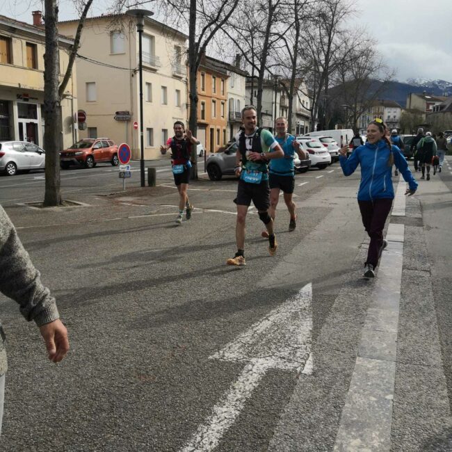 - Mél D: « Un smily trail! Voici le mot clef de cette épopée. J’ai adoré courir avec mon trinôme de Mél. Et en plus, le soleil était au RDV. Je ne porte pas de dossard pour remporter un podium mais pour partager ces moments avec des amis. Pour des souvenirs inoubliables. Je me suis bien fait plaisir dans les descentes techniques jusqu’à Roquefixade. A partir du 26e km, le dessous de mon genou gauche a commencé à se faire sentir dans ces mêmes descentes. Surtout dans la dernière incorrigible de la ligne d’arrivée à Lavelanet. Je savais ma tête de péroné un peu fragile par manque de régularité ces derniers temps et de fatigue accumulée. Mais le fait d’être à trois, entre copains, a permis de mener à bien cette mission et de garder ce fameux smile tout au long de ces 7h de course. On recommence quand vous voulez mes 2 autres Mél! »